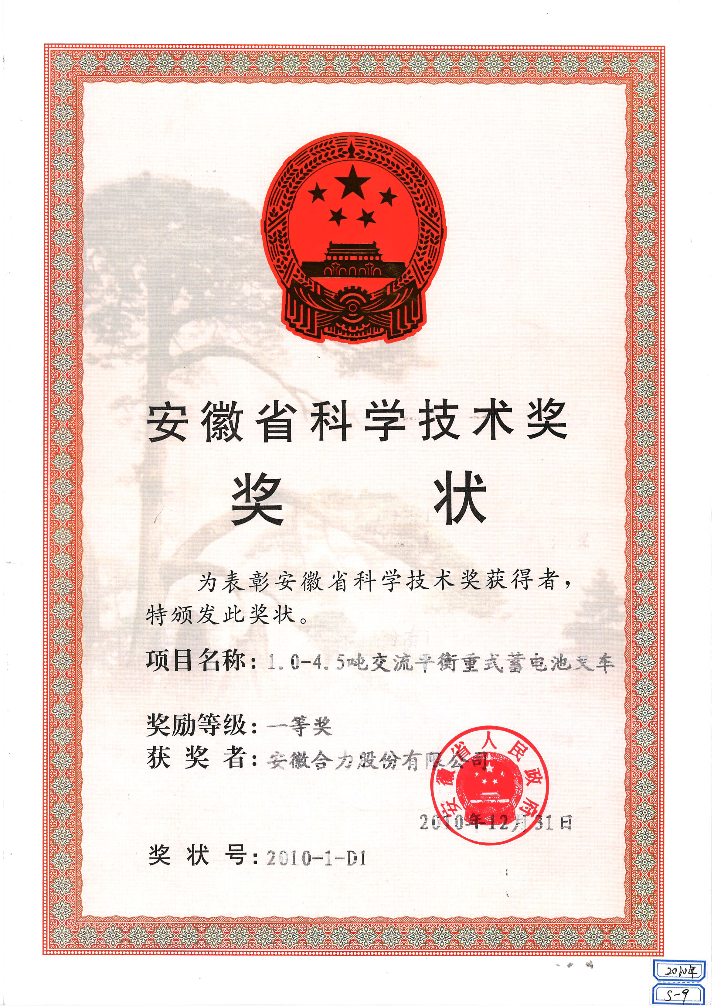 2010 安徽省科學(xué)技術(shù)獎(jiǎng)獎(jiǎng)狀:1.0-4.5噸交流平衡重式蓄電池叉車一等獎(jiǎng)