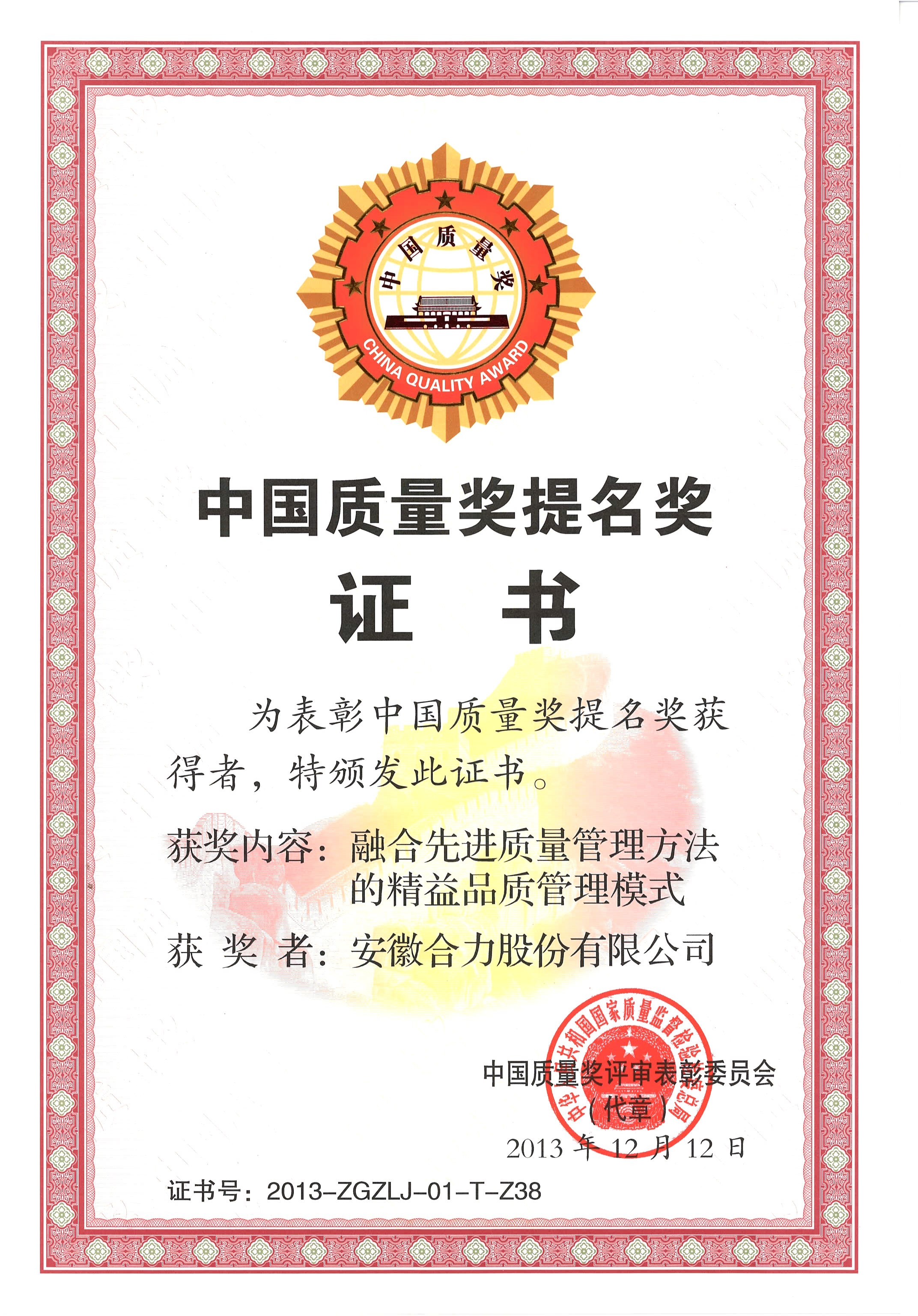 2013 中國(guó)質(zhì)量提名獎(jiǎng)