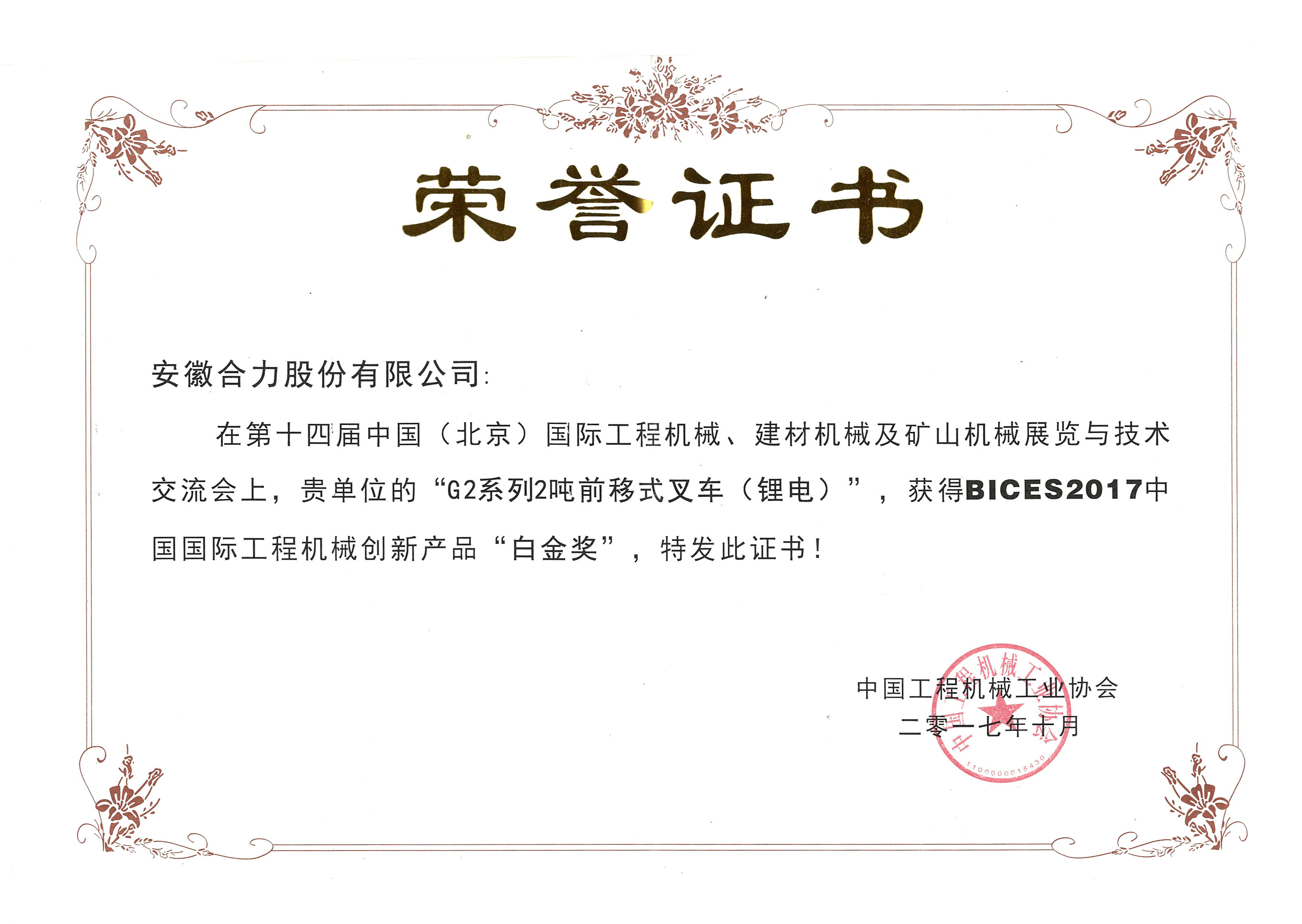 2017 中國(guó)國(guó)際機(jī)械白金獎(jiǎng)G2-2噸前移式鋰電