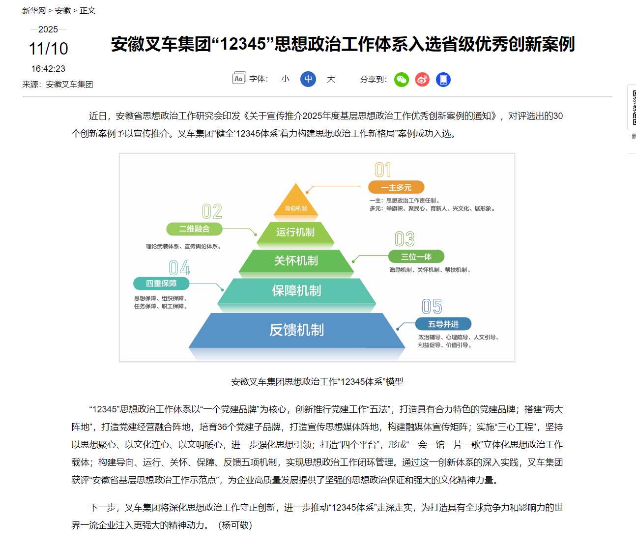 查看詳情 >【新華網(wǎng)】安徽叉車集團“12345”思想政治工作體系入選省級優(yōu)秀創(chuàng)新案例